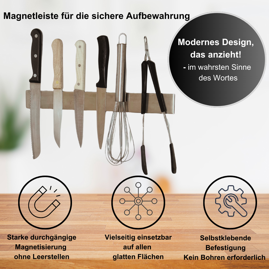 Die integrierten starken Magneten sorgen für sicheren Halt – selbst bei schwereren Küchenutensilien oder Werkzeugen. Die rostfreie Edelstahloberfläche überzeugt durch Langlebigkeit und eine edle Optik. Perfekt für Küche, Werkstatt, Büro oder Garage – ideal für alle, die ein aufgeräumtes Umfeld mit Stil schätzen.